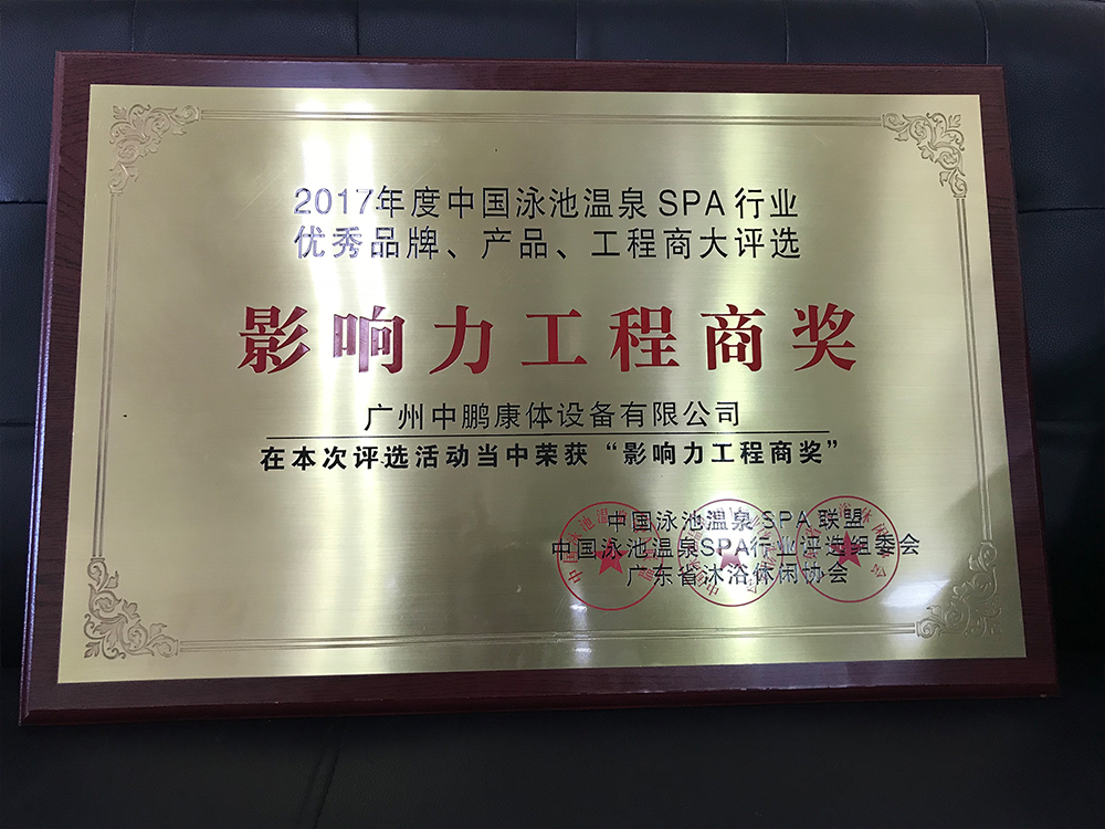 廣州中鵬康體設(shè)備有限公司一舉獲得“2017年度中國(guó)泳池溫泉SPA行業(yè)影響力工程商獎(jiǎng)”的殊榮,足見廣州中鵬康體設(shè)備有限公司的整體綜合實(shí)力得到了泳池溫泉SPA行業(yè)界的肯定!